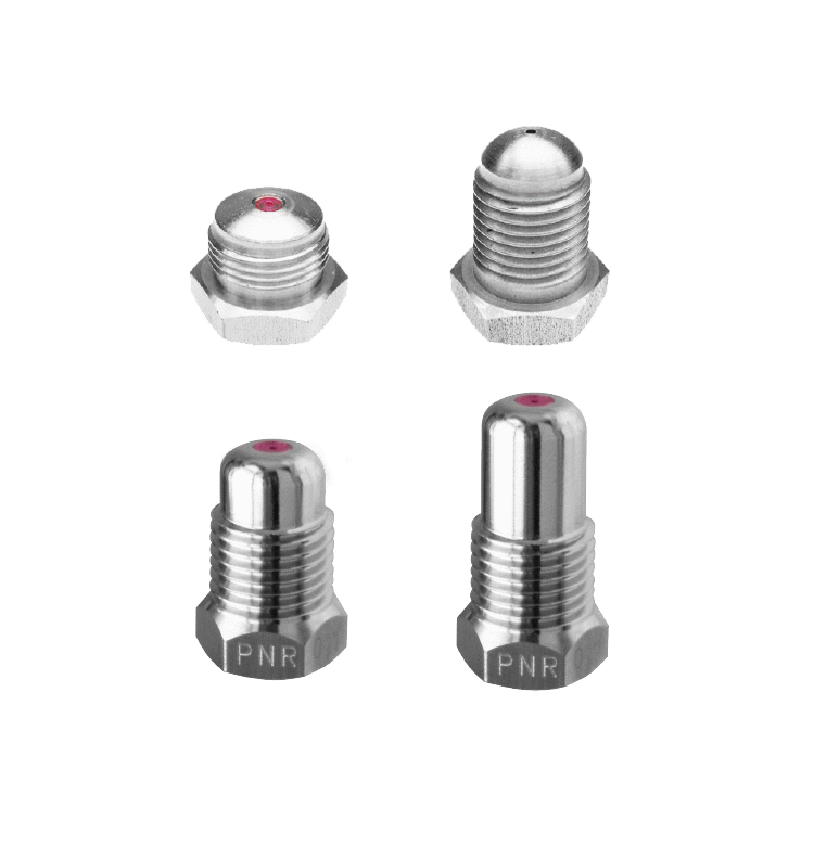 喷量范围 0.19 ~ 12.7 l/min at 10 bar 螺牙尺⼨ 1/4"BSPT、1/4"NPT、9/16-NEF外螺牙 选⽤材质 噴⼝材質: 不銹鋼SUS303、不銹鋼SUS316L、紅寶⽯ 喷口直径 不銹鋼噴⼝直徑:0.35、0.7、0.85、1.0、1.4、1.8、2.4、3.2mm 寶⽯噴⼝直徑:0.4、0.5、0.6、0.7、0.8、0.9、1.0、1.1、 1.2mm 本体材质 不銹鋼SUS303、不銹鋼SUS316L