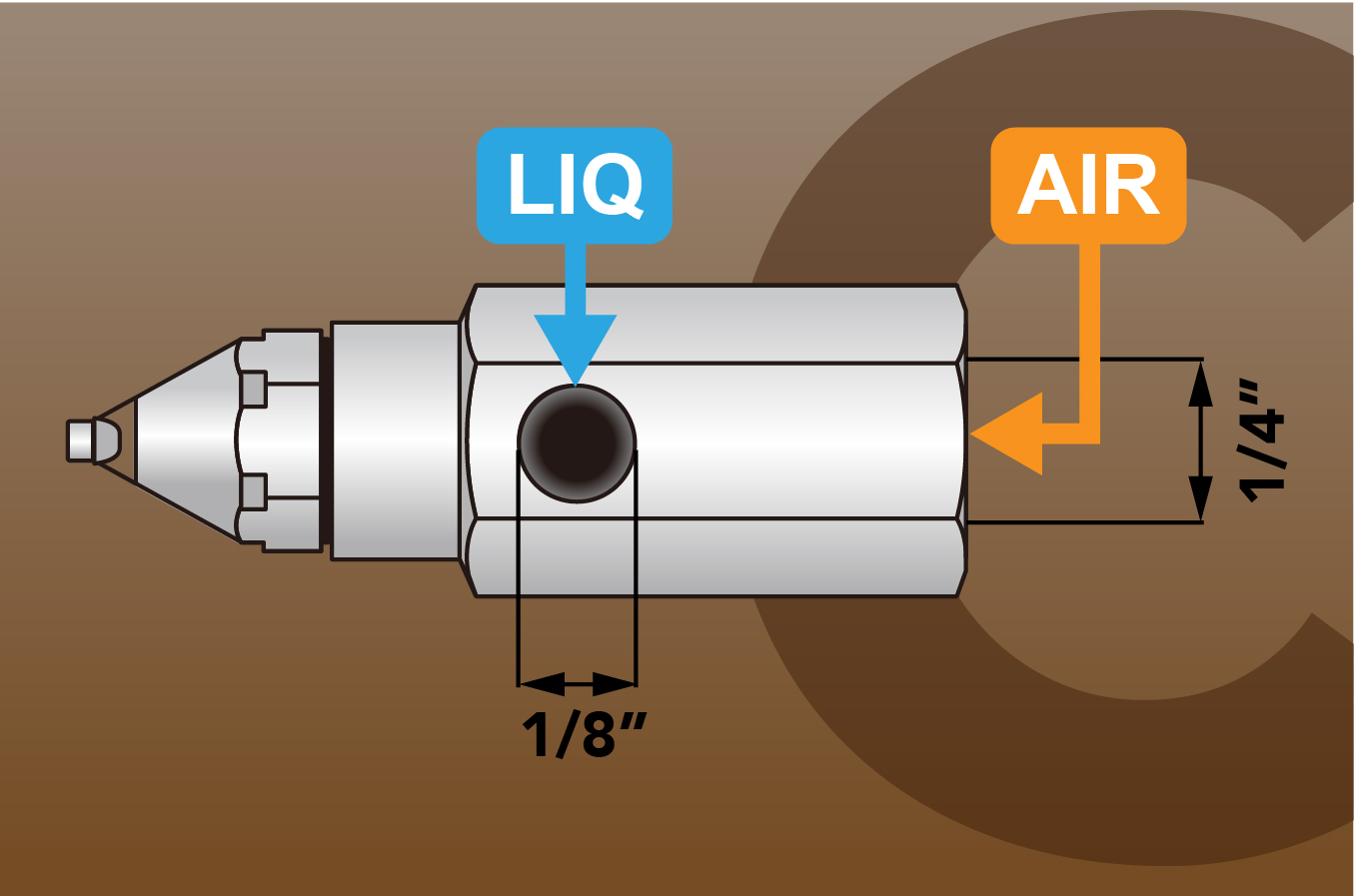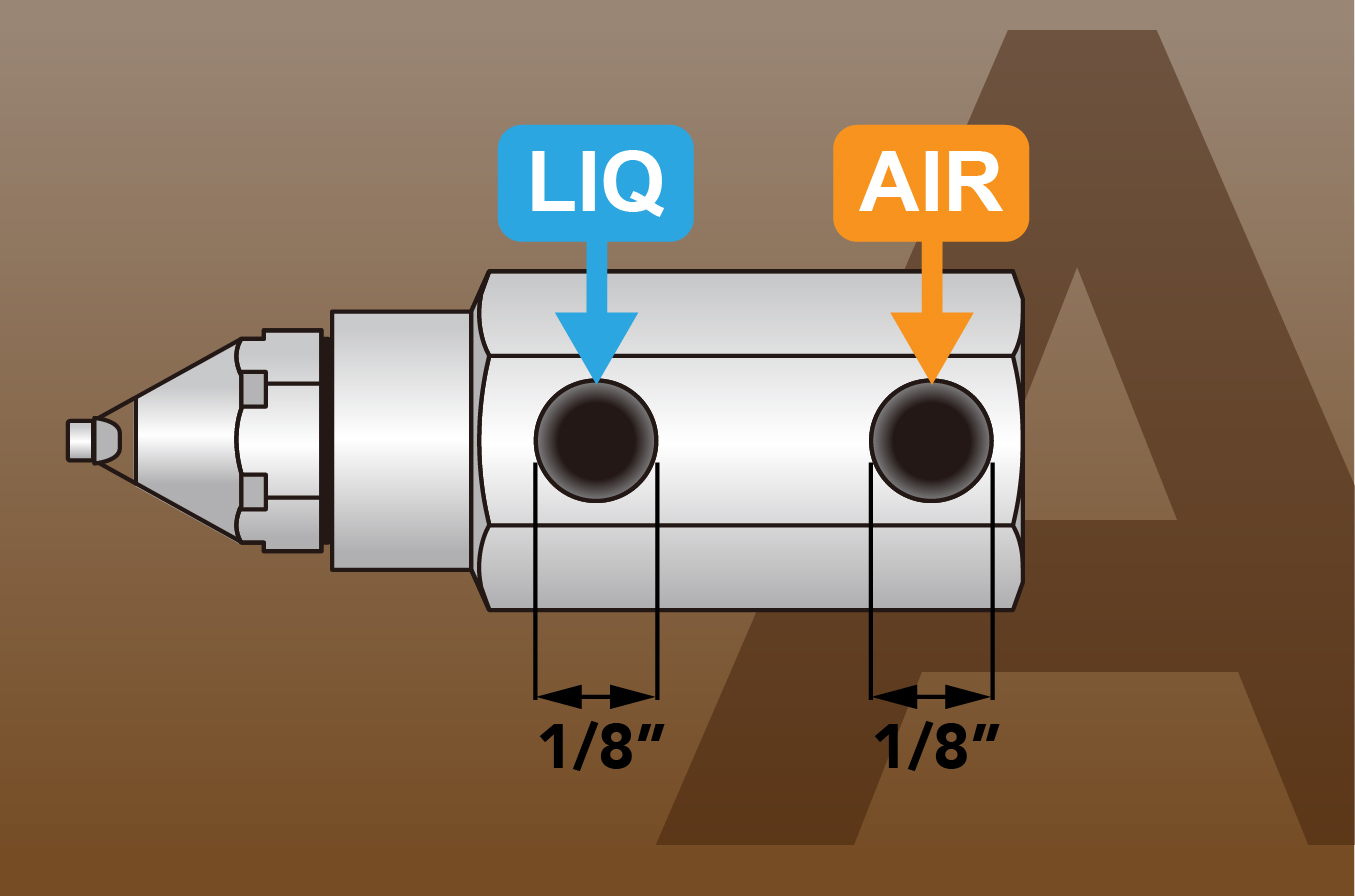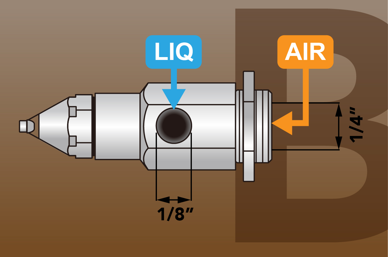 霧化過程分為⼆個階段,第⼀階段液體先與壓縮空氣混合產⽣細⼩的霧化液滴噴出噴嘴外,當霧化的液滴撞擊到噴頭前端的超⾳波產⽣器立即再微霧化成更⼩的液滴稱為第⼆階段。