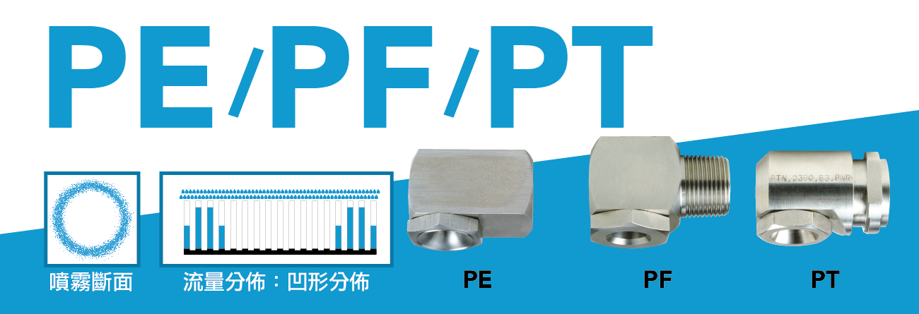 PE/PF/PT系列空⼼圆锥形喷嘴,喷嘴内部没有任何扰流叶片,利⽤离⼼⼒原理将液体雾化喷出,有效防⽌喷嘴堵塞,接合⽅式有外螺牙、内螺牙及快拆式等三种,更可以搭配PNR原厂管扣(PIPE CLAMP),⽅便现场施⼯及维修保养。